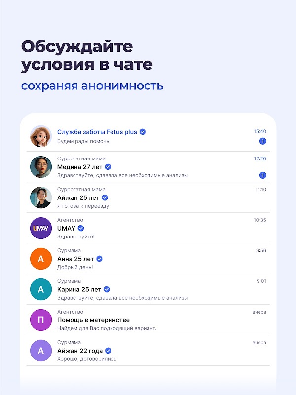 “Het FetusPlus-platform is een uitstekende oplossing voor ons gebleken. We vinden snel geschikte draagmoeders en donoren, alles is handig en transparant. Een echte vondst voor bureaus!” — Welcome Baby Agency, Astana