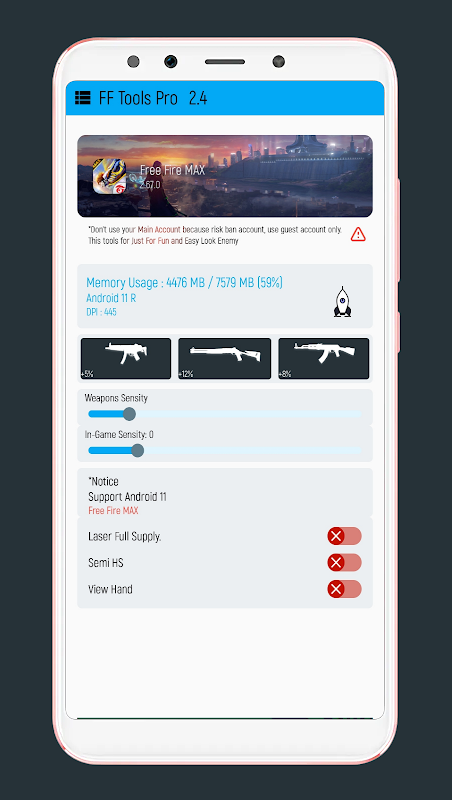 FF Tools is a performance optimization application designed to enhance your gaming experience. This utility should be launched prior to starting the game to achieve optimal results. It offers several key features including RAM optimization to improve system performance, smart lag reduction capabilities to ensure smoother gameplay, and general gameplay optimization functions. The application is compatible with Android 11 devices. By boosting system resources and reducing latency issues, FF Tools helps players enjoy a more responsive and fluid gaming experience with fewer technical interruptions.