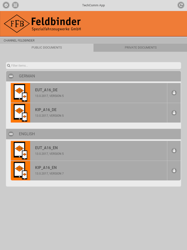 Die FFB-Dokumentations-App stellt einen interaktiven Zugang zu den aktuellen Betriebsanleitungen für Feldbinder-Silofahrzeuge in mehreren Sprachen bereit. Die Informationen zur sicheren Bedienung beim Beladen und Entladen, zur Wartung oder Reinigung werden anschaulich und in responsivem HTML5 für Tabletts und Smartphones dargestellt.. Der Anwender kann die Dokumente alternativ online lesen oder für die Offline-Nutzung auf das Gerät herunterladen. Der Anwender wird dann über Updates von Dokumenten informiert.