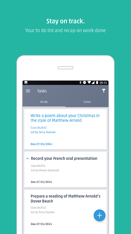 Gewoon inloggen met uw school code (uw leraar kan je deze te geven!) En zie uw volledige dienstregeling, met inbegrip van die leraar die je hebt en waar elke les is. Uw docenten kunt u huiswerk of andere taken, die zal worden opgelost zodat u altijd op de top van wat je hoeft te doen sturen. Als u wilt, kunt u uw eigen taken toevoegen en koppelen aan een bepaalde klasse, het creëren van een persoonlijk to do list.