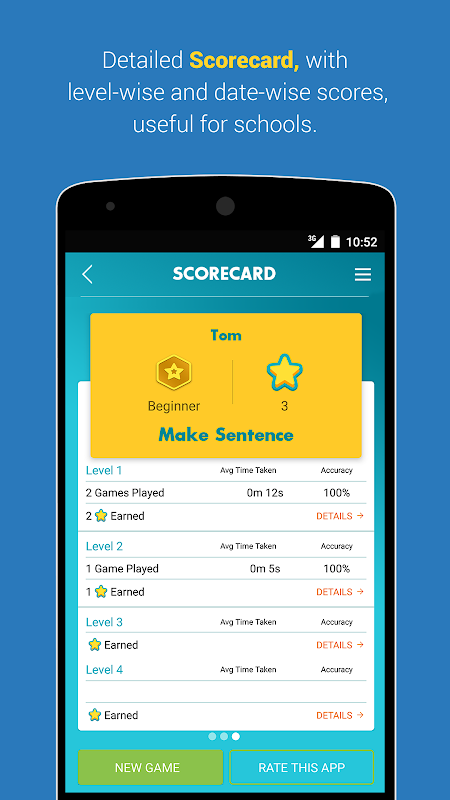 The app uses 500 most frequently occurring phonetic and sight words, and sentences constructed from those words. Each of the activities have multiple levels. The words are ranked based on how frequently occurring they are – the most frequent words which are also easy to spell are put in the first level, next ones are in the second level and so on.