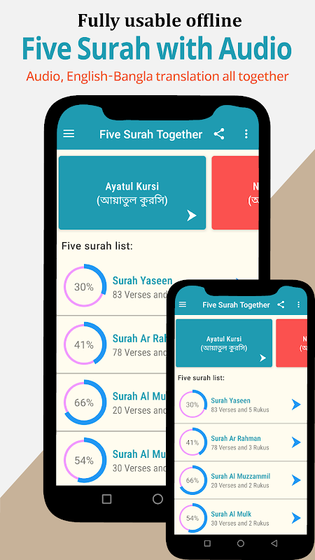 Five Surah met offline audio- en vertaalapp gebouwd met een interactief UI-ontwerp. We hebben de vijf meest gereciteerde en meest voorkomende soera's van de Koran toegevoegd. Niet alleen dat we Engelse en Bengaalse vertalingen hebben toegevoegd, zodat gebruikers deze gemakkelijk kunnen begrijpen. Elke soera heeft een andere opslagoptie en daarom wordt automatisch uw afspeelgeschiedenis van soera-audio opgeslagen. Als je terugkomt om naar de soera te luisteren, begint deze vanaf het punt waar je was gebleven. Er is nog een optie om de soera opnieuw vanaf het begin te starten.
