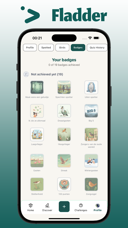 Fladder is niet zomaar een app — het is een avontuur. Met een speels en belonend systeem stimuleert Fladder je om vaker naar buiten te gaan, beter te luisteren en meer te leren. Elke vogel telt!