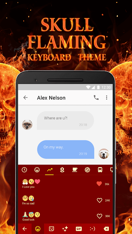 This Flaming Skull Keyboard Theme uses Facemoji Keyboard Facemoji Keyboard + GIFS. Please click the link to have it installed first.