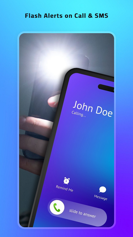 Door het gebruik van flitswaarschuwing led-zaklamp bij oproep en sms, ontvangt u direct een flitswaarschuwing bij oproep-sms wanneer iemand contact met u probeert op te nemen, en het is ook vermeldenswaard dat u met de flitswaarschuwingen bij oproep-sms-app kunt specificeren het aantal flitsen van zaklampoproep- en sms-waarschuwingen, evenals het aantal keren dat de zaklamp oplicht bij inkomende sms-berichten. Het enige wat u hoeft te doen is de flitswaarschuwing bij oproep op uw telefoon te activeren, en de flitser werkt automatisch wanneer deze overgaat en u krijgt de krachtigste app voor flitsmeldingen.