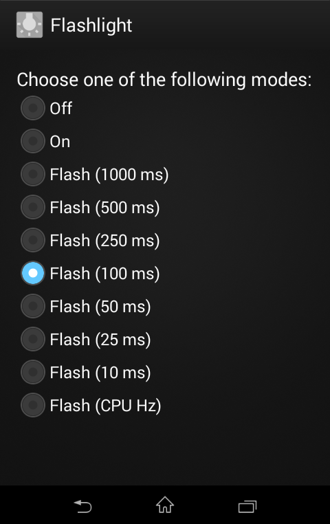 This application allows the user to select a wide range of different modes using the device's flash (NOTE: If the device has not flash, the app will not work correctly).