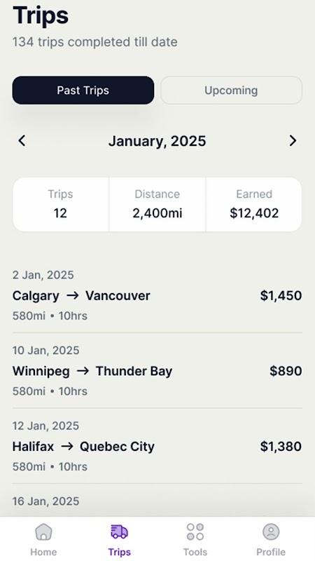 Ritlijst en details: bekijk een uitgebreide lijst met beschikbare ladingen (TRIPS) op uw startscherm. Tik op een reis om de details ervan te bekijken en uw reis gemakkelijk te starten.