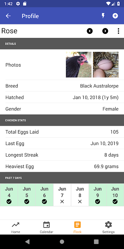 * Voeg je kippen toe om een profiel aan te maken met ras, uitkomstdatum en een profielfoto.