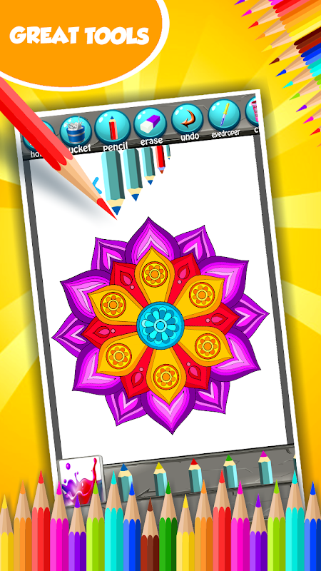 Geniet van de adembenemende schilderijervaring en je voelt hoe het je stemming en emoties op de best mogelijke manier beïnvloedt. De laatste bloemmandala kleurenpagina's zijn stressverlammend en ze zullen je kalmeren in een oogje terwijl je aan de schetsen werkt. Ga naar de foto pagina en kies de een met de mooiste bloemen. Vervolgens verken je het verfpalet om de perfecte kleurencombinatie daar te vinden, zodat je het meesterwerk van kunst kunt creëren. U kunt ook uw eigen afbeelding met behulp van de potlood maken. U kunt de grootte wijzigen volgens uw behoeften en als u een fout maakt, kunt u de gum gebruiken om deze te corrigeren. Selecteer de tekening van de geweldige bloem afgerond met romantische hartjes en waterdruppels en maak de meest romantische foto uit die u kunt opslaan in de galerij. Daar kunt u het doorzoeken wanneer u het wilt bewonderen. U kunt het ook als achtergrond op uw smartphone instellen. Download gratis het populaire Flower Mandala Coloring Book en geniet van de mooiste illustraties en binnenkort wordt het uw favoriete tijdverdrijf.