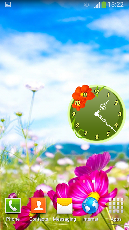 Bloemen Klok Widget biedt u tien prachtige foto's van mooie "lentebloemen" met tien florale ontwerpen gemaakt voor cijfers en paar handen! Ontsnap naar het paradijs met de meest mooie klok widget op de markt! Voel de frisheid van de lente elke keer dat je een kijkje nemen op uw liefde app widget! Kijk hoe mooi gele en paarse bloemen staan op een groen veld, terwijl veel kleine blaadjes vallen op hen! Deze mooie witte en roze bloemen zijn een echte!
