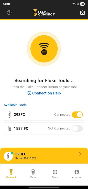 2. Verbind met behulp van de in de app geïntegreerde handleiding een Fluke Connect™-instrument met de app. Sla vervolgens uw temperatuur-, mechanische, elektrische en trillingsmetingen op en deel deze met anderen.