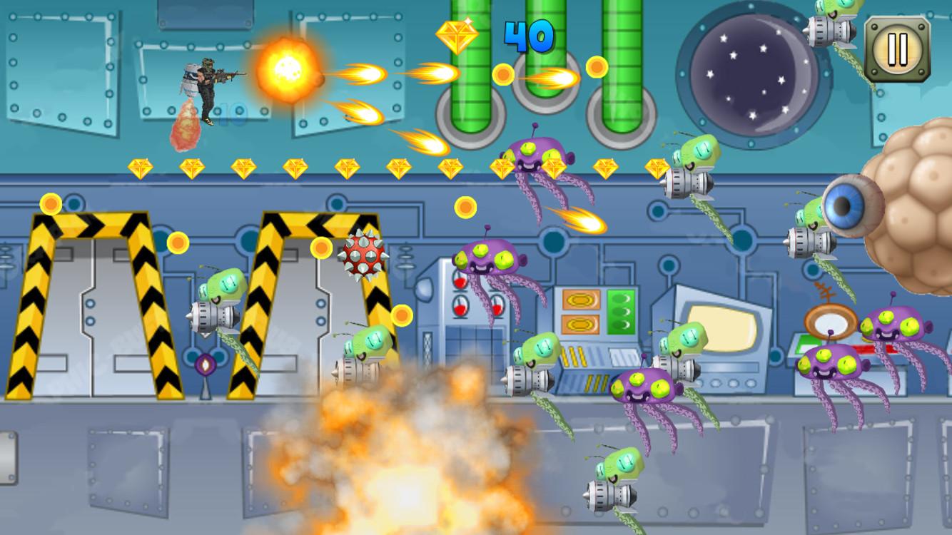 An elite commando wearing a jetpack fights aliens in a bid to take over their space ship in a deadly battle pitting human modern weapons against alien weaponry. Enter their space ship fortress to counter strike enemy sentries and the brain boss. Collect the diamonds. Aim for high score.