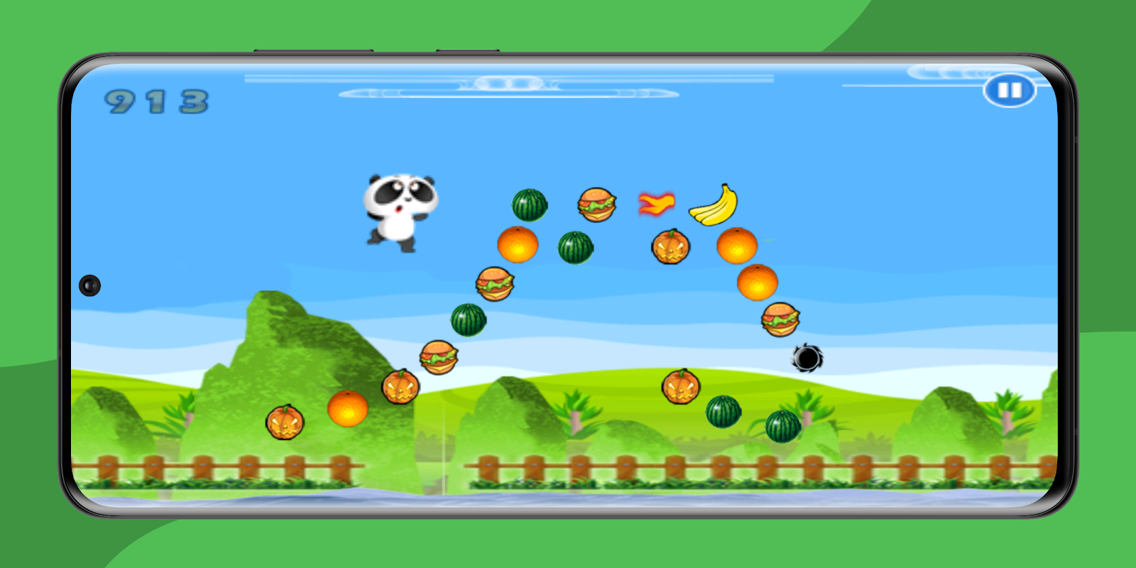 Vlieg, spring en verzamel! Eindeloos plezier met de schattige panda - spring en grijp de vruchten.