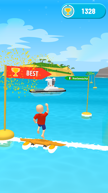Tap and hold the screen to feed the water into your jet board and make your Flysurf Sky! dash faster and farther! Don’t forget to release your hold when the vibration is too high – otherwise it’s game over!