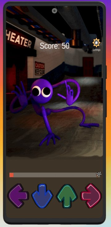 FNF Purple Rainbow Mod Test heeft een eenvoudige en intuïtieve bediening - klik op de pijlen op het scherm van uw apparaat en Purple zal bewegen en een geluid maken. Om het je nog leuker te maken, krijg je na elke klik punten en klinkt er muziek op de achtergrond. Trouwens, in FNF Rainbow Purple Test kun je de muziek uitschakelen en alleen naar de stem van de hoofdpersoon luisteren.