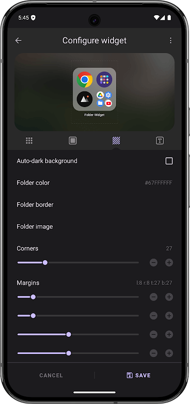 - Aangepaste widgetgrootte, achtergrondkleur, radius, marges en opvullingen