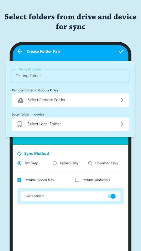 U hoeft alleen de Google Drive-map en de lokale apparaatmap voor synchronisatie te selecteren. U kunt ook uw synchronisatiemethode instellen: tweerichtingsverkeer, alleen uploaden en alleen downloaden. U kunt ook de voorkeur voor synchronisatiebestanden instellen: sluit verborgen bestanden uit en sluit submappen uit.