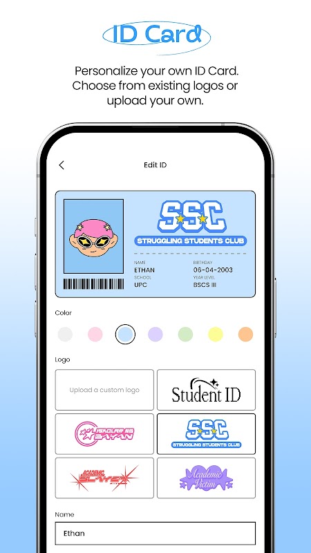 - Maak uw aangepaste identiteitskaart! Kies uit verschillende logo's of upload uw eigen logo's om deze uniek te maken.