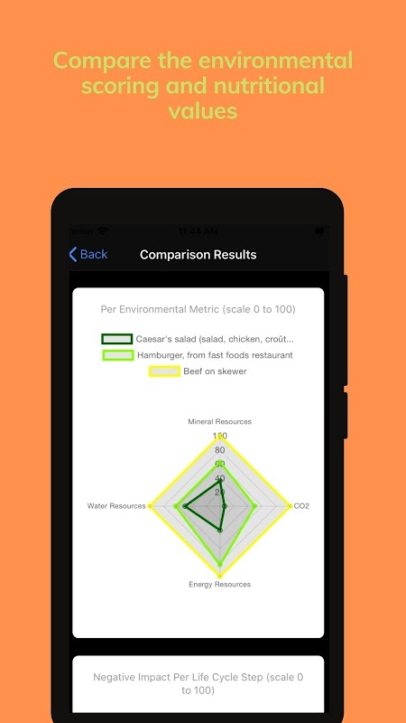Select products and compare their environmental scoring and nutritional values. Food items metrics are plotted into charts to help you relatively visualize their environmental impact.