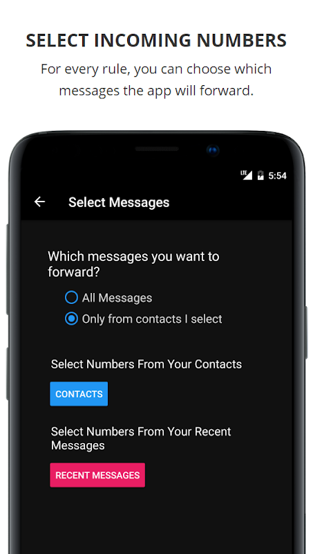 The app allows you to forward incoming SMS messages to any number in the world. You have the option to forward all the messages or some of them as per your needs. You can forward messages to multiple numbers also.
