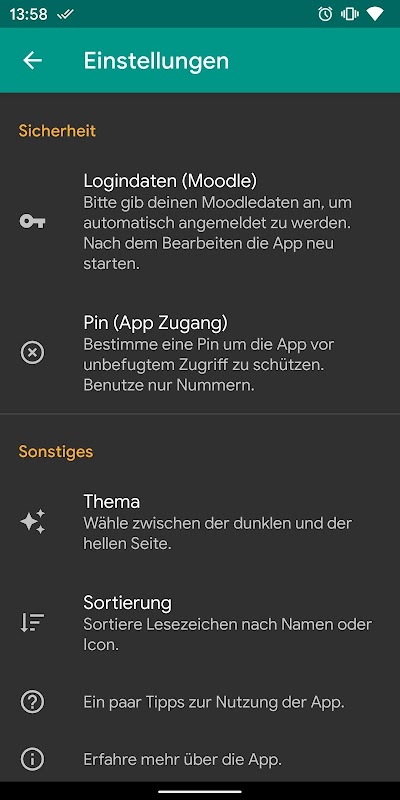 FOSS Moodle laat je de mobiele website van Moodleinstanzen zien. Om dit te doen, moeten de link, gebruikersnaam en wachtwoord van uw account worden ingevoerd. Standaard is de app ontwikkeld voor de Heinrich Hübsch School in Karlsruhe.