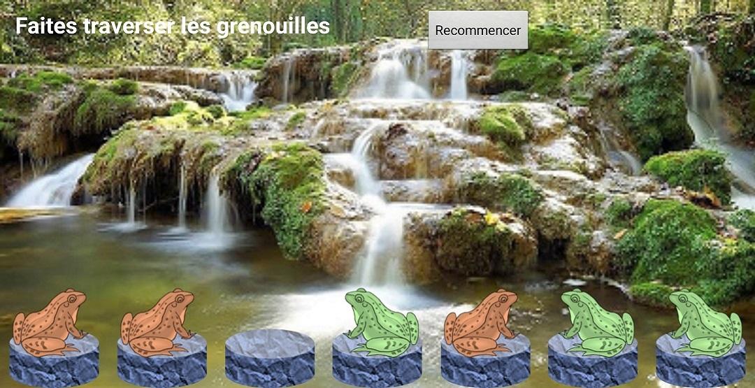 Het spel bestaat uit kikkers die een rivier oversteken. Degene aan de rechterkant gaan naar links, die aan de linkerkant gaan naar rechts.