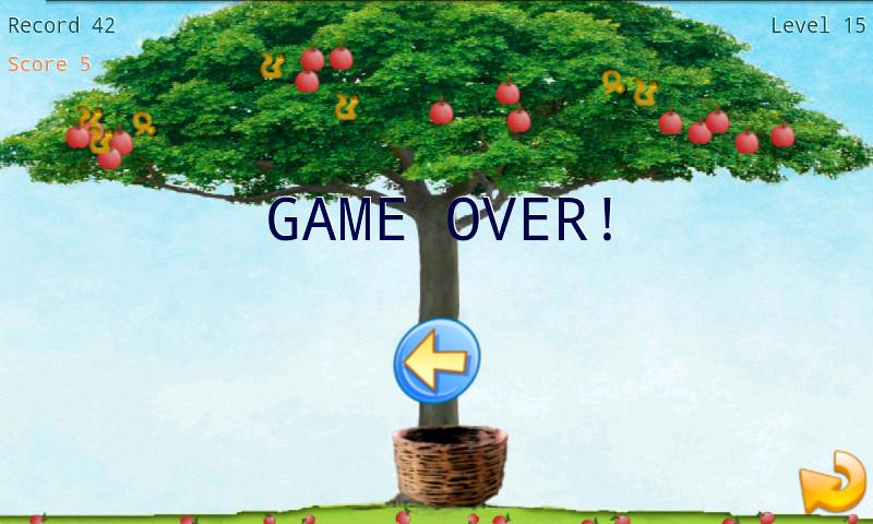 In the arcade mode the objective is to collect as many apples as possible to have access to the next level and beat the overall record. For each level you have 15 seconds available, plus any bonuses and a maximum of three apples to drop. By Level mode you can select the level to play with (1 to 15) with the aim of improving the level of individual records. For each game we cannot drop out of the basket at most three apples. During the game we have to be careful not to take any worm that falls from the tree, or the game ends immediately, and no worm-eaten apple, which is equivalent to an apple lost.