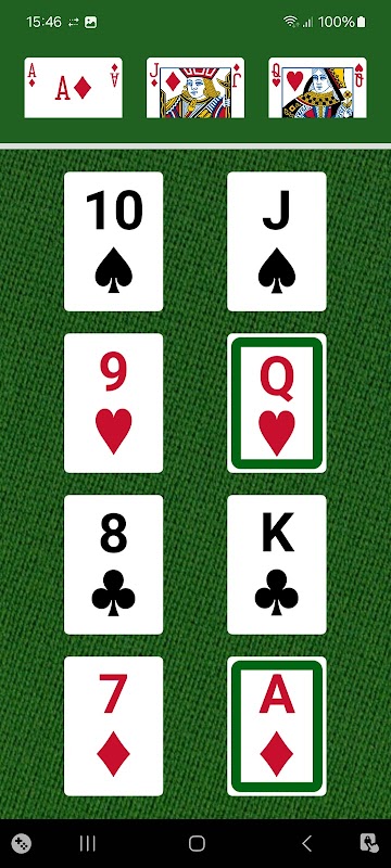 1. Je kunt een kaart slaan als er zo'n kaart tussen de drie op het scherm staat. Dit is een volledige wedstrijd.