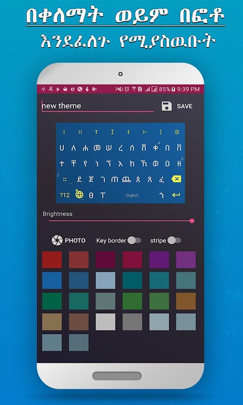 Met FynGeez Amhaars toetsenbord kunt u uw toetsenbord aanpassen met kleurenthema's en kunt u zelfs uw eigen thema maken.
