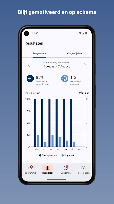 Krijg ondersteuning bij de uitvoering van uw oefeningen, lees het voorlichtingsmateriaal en vul vragenlijsten in dankzij notificaties binnen de app.
