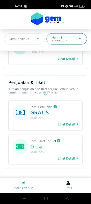 2. De GEM Analytics-app is een handige manier om "Penjualan Tiket" te analyseren. Ketahui totaal tiket terjual, beserta persentase kenaikan atau penurunan penjualan dari waktu ke waktu.