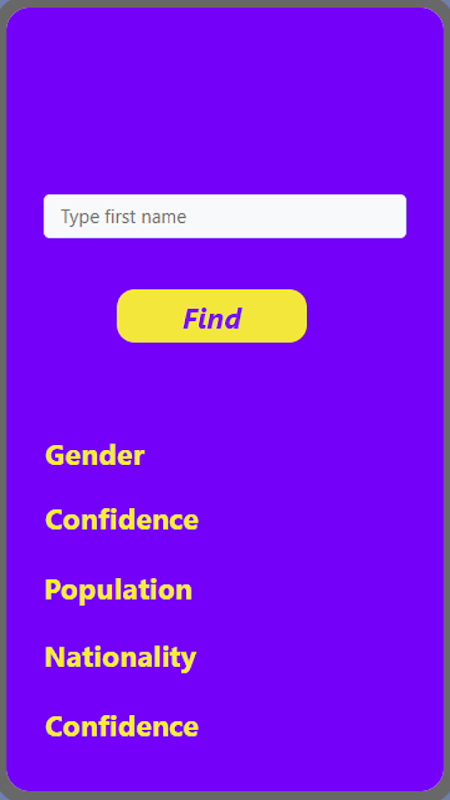 Dit is een eenvoudige gok-app waarmee gebruikers het geslacht en het land van elke persoon op deze wereld kunnen vinden. Het enige wat u hoeft te doen is gewoon de voornaam invoeren en op Zoeken klikken om alle informatie binnen enkele seconden te krijgen!