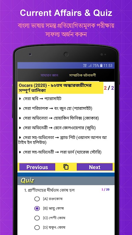 Vanuit deze app kun je elke dag Bangla GK en Actualiteiten Q&A lezen, waar het elke dag wordt gepost. Je kunt ook deelnemen aan verschillende quizzen, waaronder GK Bengali Pdf.