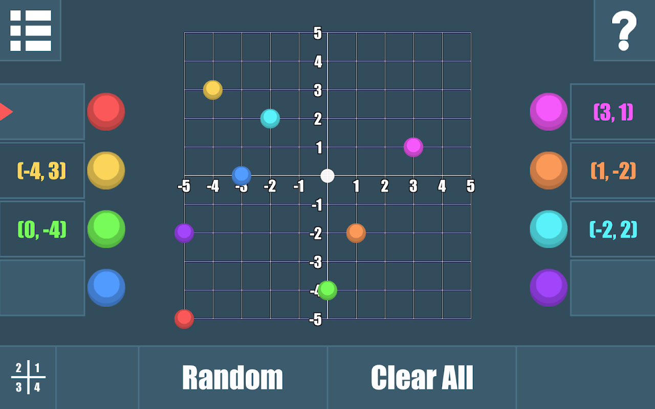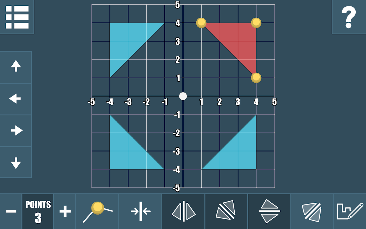 Coordinates – Explore coordinates in the first or all quadrants. Drag individual points and use the hide/reveal boxes to display the coordinates.