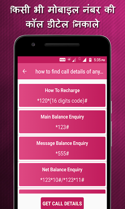 How to get call details of any number application helps the Indian prepaid telecom users to find the numbers for specific operations like Recharge, Main, Message, Net Balance enquiry, Finding own number and Customer care number. As of now app supports telecom operators like Airtel, Aircel, Idea, Vodafone, Uninor, Tat Docomo, BSNL and Reliance.