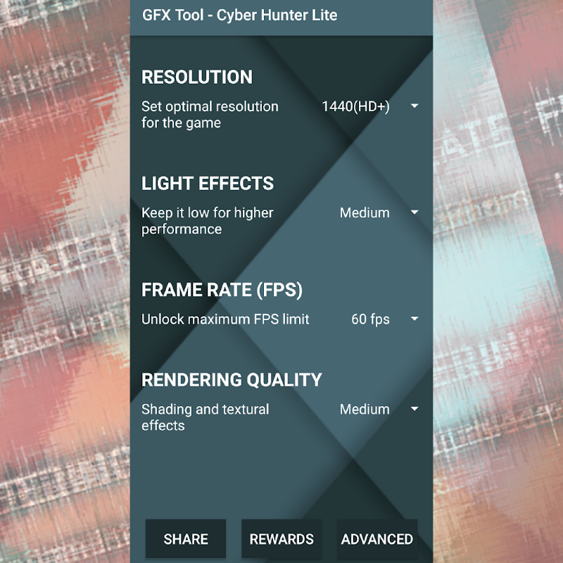 Deze GFX-tool is de meest geavanceerde grafische tool-optimizer en speciaal gecodeerd en geprogrammeerd voor het optimaliseren en aanpassen van grafische afbeeldingen van Cyber Hunter Lite in low-end telefoons.
