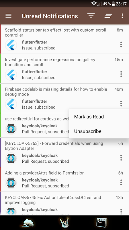De applicatie controleert periodiek de GitHub-server op nieuwe meldingen en activeert Android-meldingen met configureerbaar geluid en trillingen om u te waarschuwen. U kunt een lijst met ongelezen GitHub-meldingen weergeven, ze filteren op opslagplaatsen, een of alle meldingen als gelezen markeren, de geselecteerde meldingsthread dempen of gedetailleerde informatie over de gemelde gebeurtenis bekijken. U kunt ook een lijst met bewaakte opslagplaatsen weergeven, een filter instellen op het type melding waarvoor u gewaarschuwd wilt worden, de bewaking ervan opheffen of gedetailleerde informatie bekijken. Gedetailleerde informatie wordt weergegeven via het GitHub-web (dat mobielvriendelijk is) of via de officiële GitHub-Android-applicatie, zodat u alle noodzakelijke details ziet en verschillende acties rechtstreeks uitvoert (bijvoorbeeld antwoorden in discussies enz.).