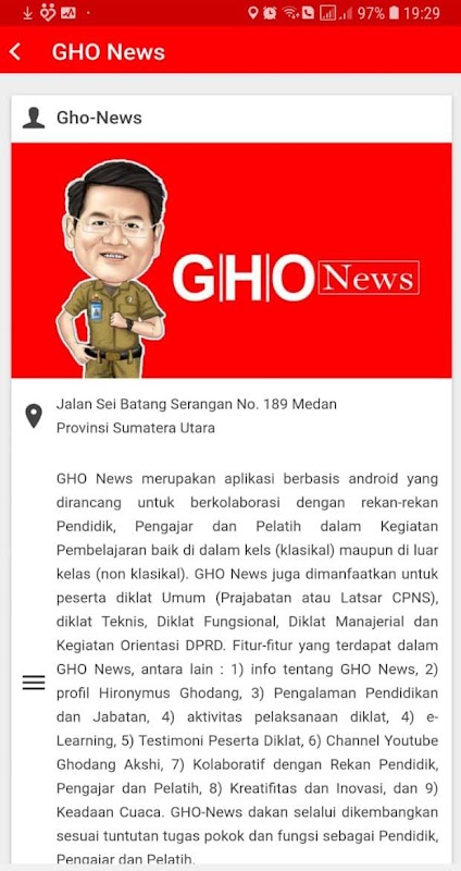 GHO News merupakan aplikasi berbasis android yang dirancang untuk berkolaborasi dengan rekan-rekan Pendidik, Pengajar dan Pelatih dalam Kegiatan Pembelajaran baik di dalam kels (klasikal) maupun di luar kelas (non klasikal). GHO News juga dimanfaatkan untuk peserta diklat Umum (Prajabatan atau Latsar CPNS), diklat Teknis, Diklat Fungsional, Diklat Manajerial dan Kegiatan Orientasi DPRD. Fitur-fitur yang terdapat dalam GHO News, antara lain : 1) info tentang GHO News, 2) profil Hironymus Ghodang, 3) Pengalaman Pendidikan dan Jabatan, 4) aktivitas pelaksanaan diklat, 4) e-Learning, 5) Testimoni Peserta Diklat, 6) Channel Youtube Ghodang Akshi, 7) Kolaboratif dengan Rekan Pendidik, Pengajar dan Pelatih, 8) Kreatifitas dan Inovasi, dan 9) Keadaan Cuaca. GHO-News dakan selalui dikembangkan sesuai tuntutan tugas pokok dan fungsi sebagai Pendidik, Pengajar dan Pelatih.