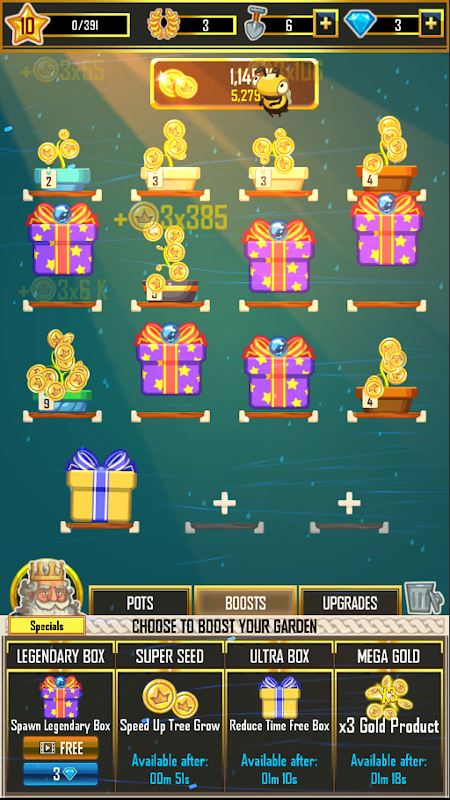 Gold Tree kan niet-actief worden! Af en toe zal elke pot wat goud genereren. Hoe beter potten, hoe beter boom je krijgt. Hoe beter boom, hoe hoger het gouden inkomen!