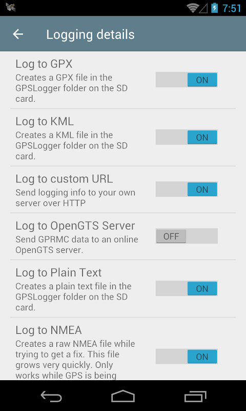 Een lichtgewicht, batterij efficiënte GPS Logger. Het doel van deze app is uw GPS-coördinaten in opgegeven intervallen naar een bestand op uw SD-kaart te schrijven. Deze app draait op de achtergrond, zodat u op een lange wandeling kunt gaan, een vlucht nemen, een autorit maken of een fotosessie organiseren. Of zelfs wat melk gaan kopen terwijl deze app zo lang als mogelijk loopt. Zodra u terug achter uw computer zit, kunt u de bestanden gebruiken om foto's te geotaggen, te uploaden naar reis-sites, te bekijken in Google Earth en zo verder.