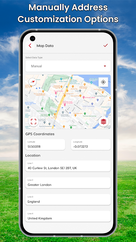 Begin automatisch met het klikken op afbeeldingen. De standaardsjabloon verschijnt op uw foto's. De sjabloon bevat de informatie over uw lengte- en breedtegraad, Plus-code, datum, tijd, adres, vochtigheid, windsnelheid en druk. Als u gegevens wilt wijzigen of alleen specifieke gegevens bij bepaalde informatie wilt weergeven. Ga eenvoudigweg naar het sjabloontabblad en bewerk uw locatiestempel met de gegevens van uw keuze. Om uw adres te wijzigen kunt u naar kaartgegevens gaan. U kunt uw adres ook naar eigen keuze instellen door de handmatige optie te selecteren.