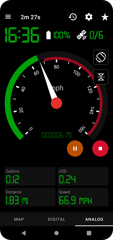 Volg moeiteloos uw autoritten, hardloopsessies, wandelingen of fietstochten met behulp van de ingebouwde GPS van uw telefoon. Schakel tussen kaart, digitale of analoge snelheidsmeter.