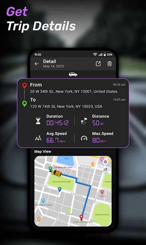 Track Your Journey: Keep track of your journeys with detailed trip logs, including distance traveled, average speed, and duration, allowing you to review your routes later.