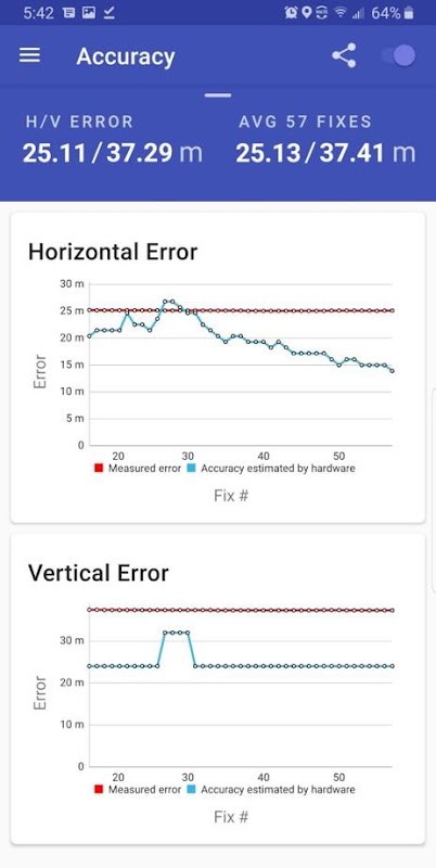 Met de functie "Nauwkeurigheid" kunt u de fout in de positie van uw apparaat meten ten opzichte van uw * werkelijke * locatie (door u ingevoerd). Andere apps laten u de * geschatte * nauwkeurigheid zien, die wordt gegenereerd door uw apparaat. Met GPSTest kunt u deze geschatte nauwkeurigheid vergelijken met * werkelijke * nauwkeurigheid!