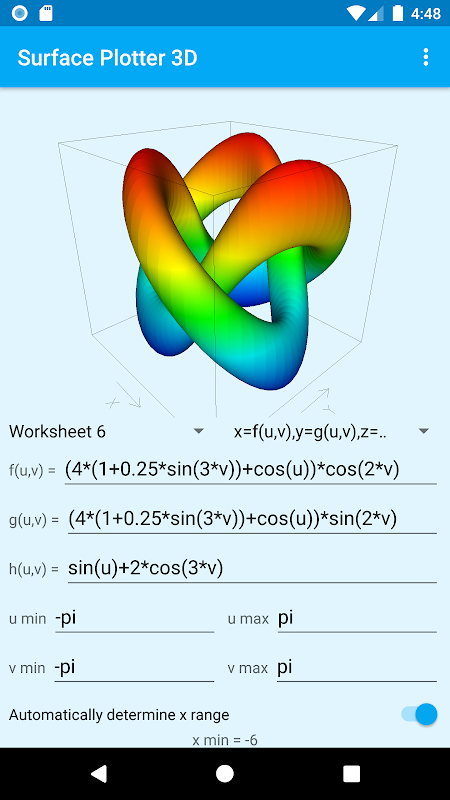 Er is een uitgebreide set reële en complexe operatoren en functies beschikbaar, dus er is volop ruimte om te experimenteren, uzelf "wat als..."-vragen te stellen en gewoon plezier te hebben met het visualiseren van wiskundige functies en ze in 3D te roteren. Raadpleeg de helppagina's, die u kunt openen door op de menuknop in de rechterbovenhoek te tikken. Deze geven meer informatie over het gebruik van de applicatie en het definiëren van functies.