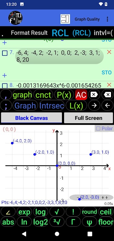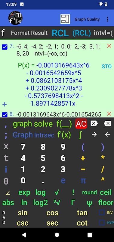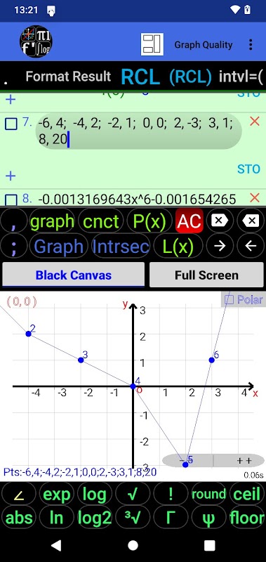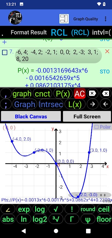• Het is de enige grafische rekenmachine die in staat is om de polynoom van de kleinste graad die door een reeks punten gaat te vinden en te plotten. Bovendien kunt u deze wetenschappelijke rekenmachine gebruiken om de beste lijn (lineaire regressielijn) te vinden en te tekenen die past bij een reeks punten volgens de Least Squares-criteria van Gauss.
