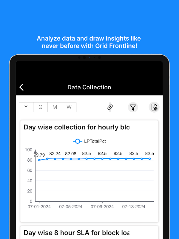 Zodra u weer online bent, maakt Grid Frontline het gemakkelijk om uw gegevens te uploaden naar de Grid web-app. Deze gegevens worden geanalyseerd en weergegeven via interactieve dashboards die oneindig aanpasbaar zijn. Met Grid kunt u aangepaste dashboards maken die zijn afgestemd op uw specifieke behoeften, of u nu KPI's wilt volgen, de prestaties van apparatuur wilt bewaken of de prestaties van personeel of teams wilt analyseren.