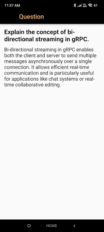 Vragen over gRPC-interviews: voor degenen die specifiek geïnteresseerd zijn in gRPC, bevat onze app een speciale sectie met meer dan 100 vragen gericht op gRPC-concepten. Verdiep uw kennis en vergroot uw vertrouwen in gRPC-interviews.