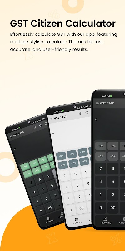 Deze gratis GST Calculator-app biedt 5 plaatconfiguraties die u kunt wijzigen via de app-instellingen. De app heeft ook een functionaliteit voor het afspelen van een geluid en het trillen van de telefoon bij het indrukken van een toets, die kan worden geconfigureerd via de instellingen.