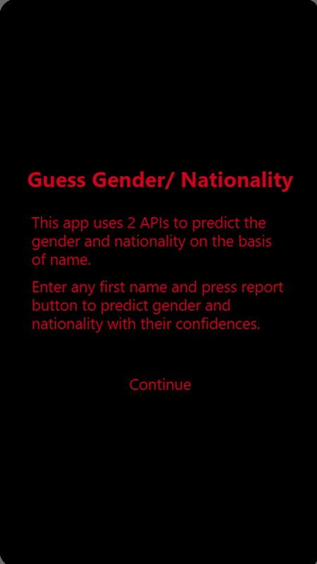 Deze applicatie vertelt je het geslacht en de nationaliteit voor elke naam ter wereld. Deze APP is alleen gemaakt voor leuke doeleinden.